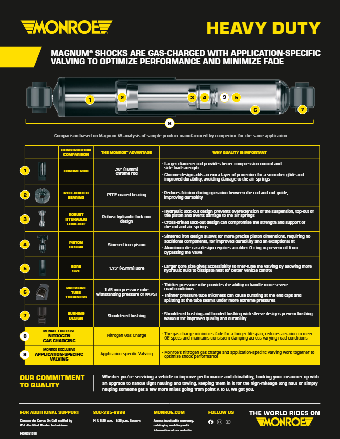 High-mileage and severe-use vehicles demand shocks and chassis parts that can take a beating. Monroe® heavy-duty components deliver the performance and durability hardworking rigs rely on. Built to meet the demands of commercial trucks, trailers and buses operating in the toughest conditions, Monroe parts keep you moving – mile after mile.